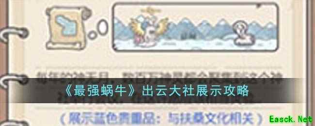 最强蜗牛出云大社展示什么贵重品?最强蜗牛中,在玩家们探索扶桑地区的时候,会遇到出云大社,要求玩家们展示一个蓝色的贵重品,与扶桑文化有关的,但是很多玩家还不知道应该展示什么贵重品才是对的,下面小编就向大家介绍,不知道的小伙伴一起来看看吧。