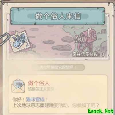 《最强蜗牛》做个俗人来信触发攻略1、打开游戏,并更新到最新版本; 2、点击邮箱查看来信,和做个俗人对话; 3、和做个俗人相互回信,他会带着猴子上门并给你礼物。 彩蛋奖励: 50个地球晚宴抽奖卷