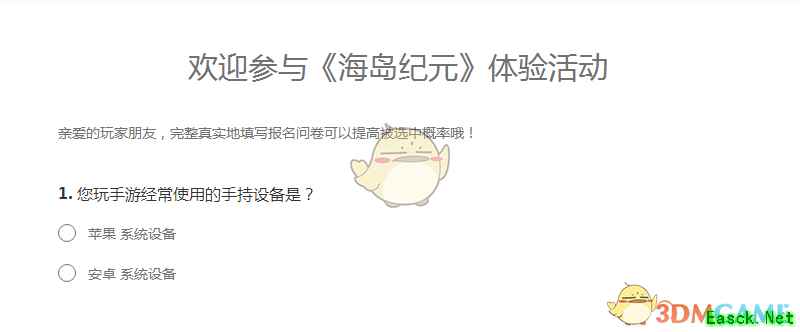首测资格预约 1、首测资格预约需完成问卷调查填写(点击跳转) 2、完成全部12道题目后,提交问卷即预约成功。 海岛纪元首测时间>>