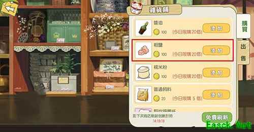 然后与她进行进行对话,就可以来购买这个粗盐了,100金币一个,然后每天限购20个,作为基础材料之一,小编认 为还是非常值得玩家来进行购买的。玩家没事的时候可以多屯一点,反正价格上也不是很贵,而且制作食物的时候肯定会 用得到。