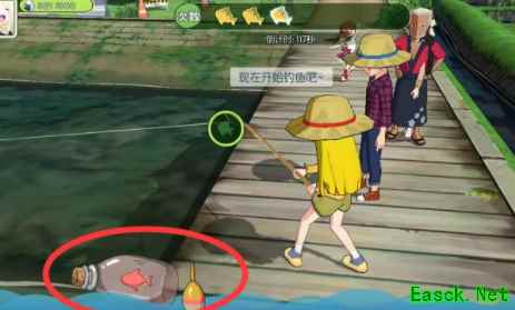 2、等下图的滚轮到瓶子的位置即可点击拉杆收起,大概重复三次就能钓到一条鱼。