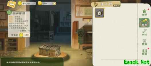 收纳箱制作方法介绍: 1、当我们获得收纳箱图之后,就能在【1级木工台】处制作收纳箱。 2、使用木头,就能制作收纳箱,推荐尽早拿到收纳箱,可以囤放更多的道具。