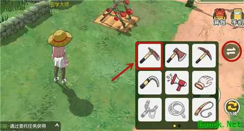 《小森生活》土地开垦方法介绍来到一片【草地】,点击下图所示切换工具的图标,将工具切换为【锄头】。
