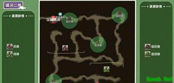 【第二层】 富镁矿、富锂矿 常见负面状态:黑暗< 30、寒冷<30(部分地区) 6级后可以在家里做抗暗装备,9级后可以做抗寒装备 地图标明的是那一排基本上都是那种矿。富镁矿、并不会显示名称为富镁矿,而是显示镁矿。富锂矿也是一样。 闪闪发亮的那些就是富矿,跟普通矿的不同在于会掉落除了矿,也会掉落砂。这个地图本来标示富矿的地方似乎不一定有富矿。关于富矿的出现条件,可能需要再研究,也可能跟一层一样是随机的。