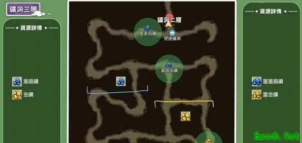 【第三层】 苍晶矿、金矿 常见负面状态:炎热< 30、中毒<30(部分地区) 9级后可以在家里做抗热装备、11级后可以在做抗毒装备 地图标明的是那一排基本上都是那种矿。 跟一、二层不一样,这个地图的富矿不会闪闪发亮,而是名字会显示富矿。这个地图似乎只有本来标示富矿的地方不一定有富矿。