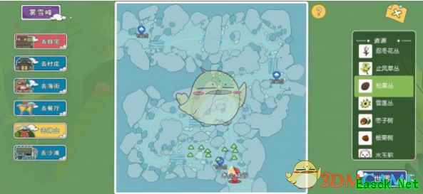 4、雾雪峰 在这张地图上可以采集到:松果、板栗、雪莲、枣子、止风草、忍冬花,地图右边点开资源有分配