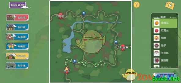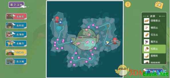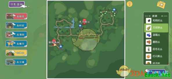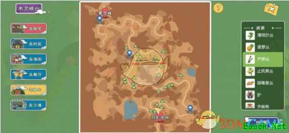 3、木灵峡谷 在这张地图上可以采集到:菠萝、芦笋、薄荷叶、止风草(果丛附近随机刷新)、御毒姜(果丛附近随机刷新),地图右边点开资源有分配