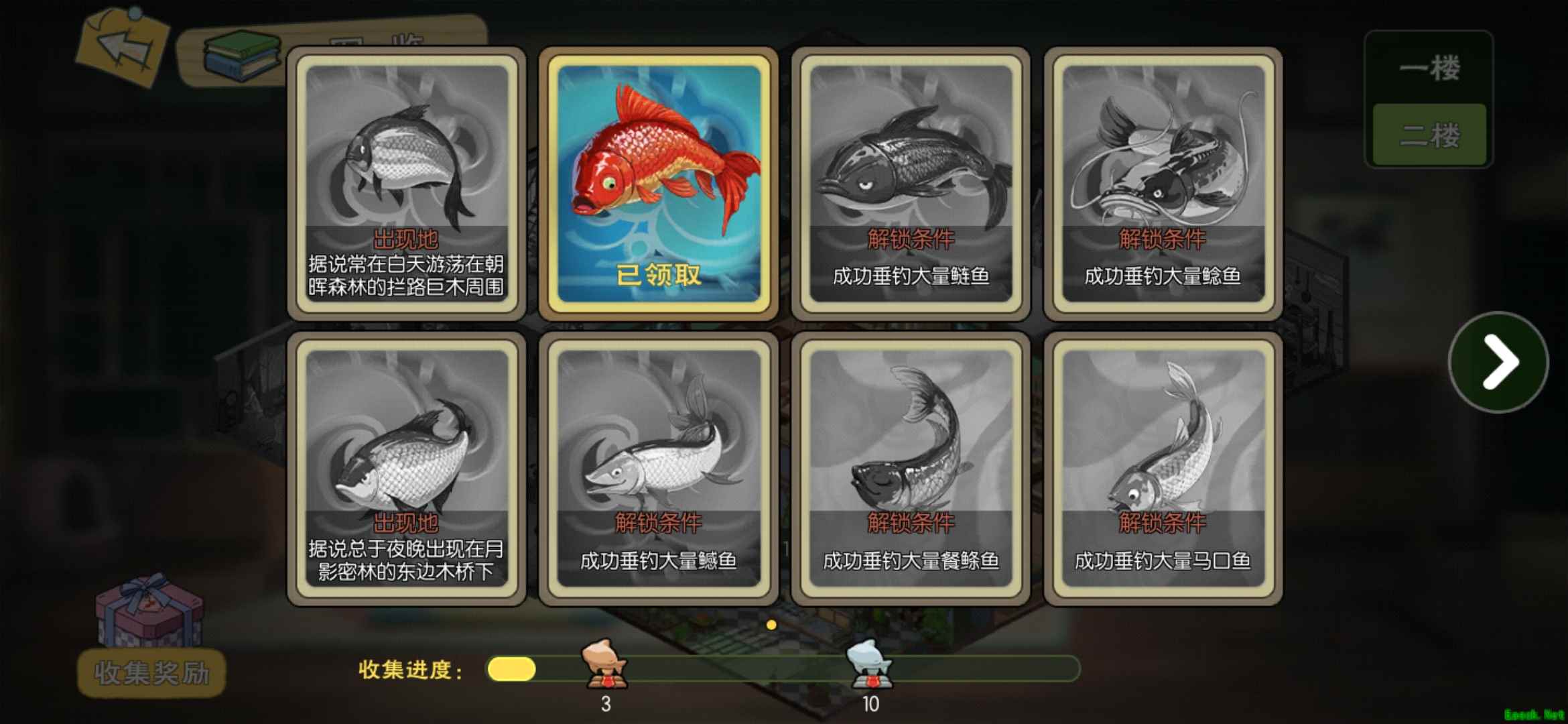 三、图鉴领取 在手机图鉴中点二楼,再进去鱼王类里可以领三种普通鱼王钓饵各10包。
