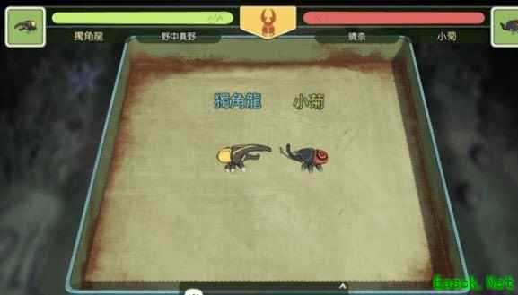 每种甲虫的技能也不同,如破竹、独角龙这类的甲虫的技能为角突,就是以长角挑刺攻击敌人造成2倍伤害,甲虫性格不同在面对战斗时的反应也不同,勇猛的甲虫进攻猛烈但受到攻击时掉血快,胆小的甲虫则防守力强。玩家可以根据对方不同的甲虫特点选择甲虫品种。 二、进行战斗