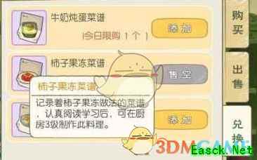 《小森生活》牛奶炖蛋获取攻略【获取攻略】 1、兑换内的两个菜谱,一个是牛奶炖蛋(厨房2级),需要五个牛奶兑换; 2、另外一个是水果拼盘(厨房4级),需要三个西瓜兑换,需要兑换的话可以提前放在背包里。。