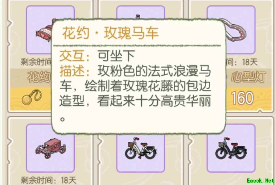 5.花约·秋千:160个水琴铃·金道具兑换 玩家们在自宅外摆放秋千后可以和小伙伴一起坐下,非常的有趣好玩。 6.花约·凉亭:160个水琴铃·金道具兑换 凉亭是自宅外的一个装饰品,但是玩家们不能在凉亭中坐下,仅供观赏。 7.花约·喷泉:160个水琴铃·金道具兑换 喷泉的摆放会让玩家们的自宅显得更加华丽和浪漫,是提升家撞时尚感的必备家具。 8.花约·玫瑰马车:160个水琴铃·金道具兑换 玩家们在自宅外摆放玫瑰马车之后可以坐下,是游戏造景和拍照的必备之选。