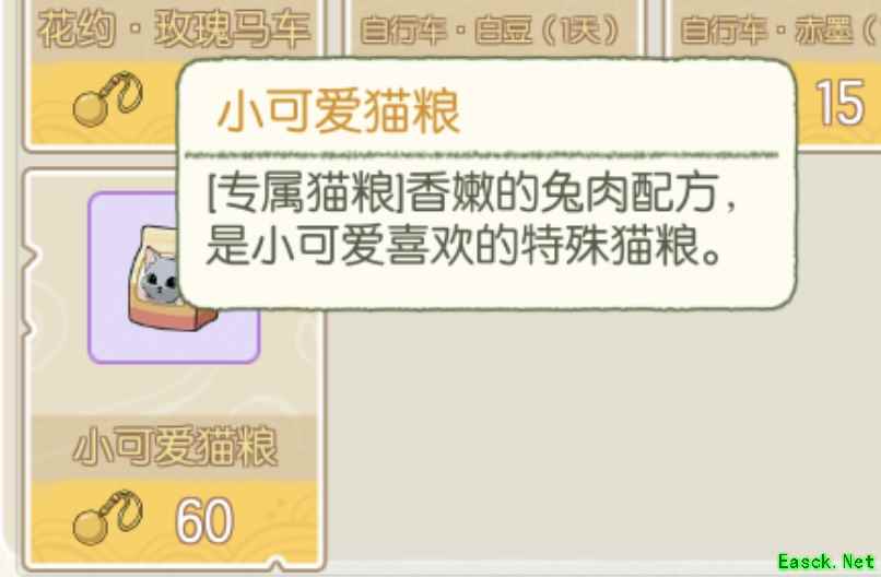 二、高级猫咪专属猫粮 1.巧克力猫粮:50个水琴铃·金道具兑换 这款猫粮是巧克力最喜欢的食物,用来投喂有几率领养。 2.酱小油猫粮:50个水琴铃·金道具兑换 这款猫粮是酱小油最喜欢的食物,用来投喂有几率领养。 3.王子猫粮:60个水琴铃·金道具兑换 这款猫粮是王子最喜欢的食物,用来投喂有几率领养。 4.小可爱猫粮:60个水琴铃·金道具兑换 这款猫粮是小可爱最喜欢的食物,用来投喂有几率领养。
