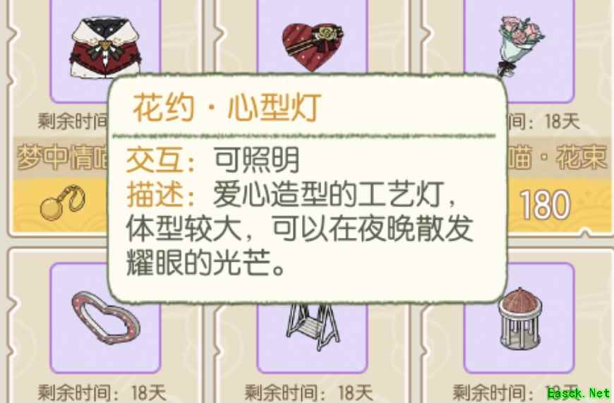 《小森生活》水琴铃金兑换攻略一、情人节花约系列家具 1.花约·心型花丛:160个水琴铃·金道具兑换 心型花丛是自宅外的装饰家具,装扮之后会让花园中充满浪漫之感。 2.花约·床:160个水琴铃·金道具兑换 玩家们躺在花约·床上可以回复体力,每日仅限使用1次体力恢复功能。 3.花约·玫瑰竖琴:160个水琴铃·金道具兑换 玫瑰竖琴是玩家们可以放在自宅花园中的大型乐器摆设,设计的非常精美。 4.花约·心型灯:160个水琴铃·金道具兑换 心型灯在夜晚可以提供照明的功能。