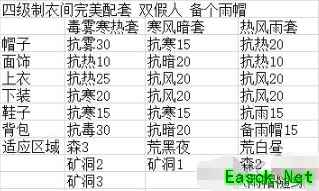四级制衣间给冷热衣服配了全套。但是点数太低了,第一次见到两件同系列还凑不够30抗性的存在。 风和寒风是完全冲突的,满足仅有的两件风衣则必然无法同时满足抗热和抗寒。 所以木灵峡谷必然需要两套衣服。由于森3的毒雾要求,最终变成3套衣服加一个备用雨帽的设计。两个假人基本可以完成任务,就是去森2的时候免不了再掏出一个斗笠。 以上就是《小森生活》四级防护性衣服搭配攻略,更多游戏攻略请持续关注手游网!