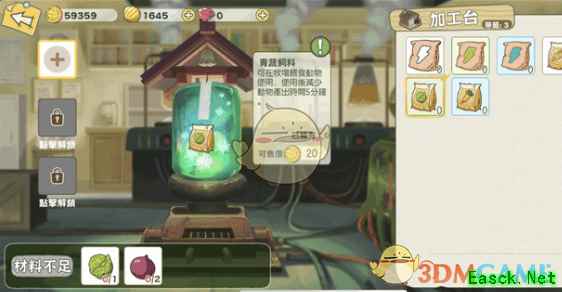 《小森生活》青蔬饲料制作攻略【制作攻略】 一、收集材料 青蔬饲料制作非常简单,只需要1颗高丽菜和2颗洋葱。高丽菜和洋葱都需要使用种子在自家的耕地上种植,高丽菜种子每颗20金币,洋葱种子每颗90金币。饲料是饲养的动物们产出的必须的物品,只有吃了饲料的动物才会生产材料,吃高级的饲料更有机会获得稀有产出物品呦。 二、制作青蔬饲料 饲料需要在加工台制作,加工台虽然只能制作饲料,但却是很多活动的关键,想要获得牛奶、羊毛、鸡蛋、兔毛都需要给动物喂饲料。不同饲料喂食后效果不同,普通饲料只能激发动物的产出状态。 青蔬饲料使用后可以减少5分钟产出时间,胡萝卜饲料可以是动物特殊产出概率增加50%。玩家可以根据情况喂不同的饲料。每个动物产出前只能喂一次饲料,产出后需要重新喂食。 青蔬饲料合成时间短,无需等待可以直接免费使用金色贝壳缩短生产时间。并建议一次性多制作一些饲料,牧场动物越多消耗的饲料量就越大,小动物可是很能吃的呦。
