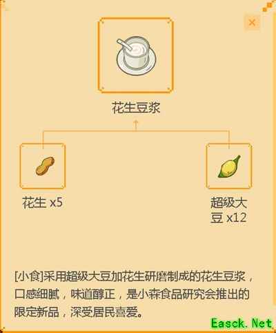 花生豆浆(小食) 花生*5 + 超级大豆*12 采用超级大豆加花生研磨制成的花生豆浆,口感细腻,味道醇正, 是小森食品研究会推出的限定新品,深受居民喜爱。 以上就是《小森生活》花生豆浆制作方法的全部内容了,更多手游攻略请关注手游网! 本文内容来源于互联网,如有侵权请联系删除。 |