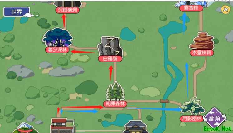 二、雾雪峰: 1、玩家首先需要通过起始地点进入“朝晖森林”,朝晖森林是游戏的初始区域,这里有两个超路口大家不要走错了,要选择进入“月影森林”。另外一个路口“白鹭岩”是进入“沉睡矿洞”的路线,大家别搞错了。
