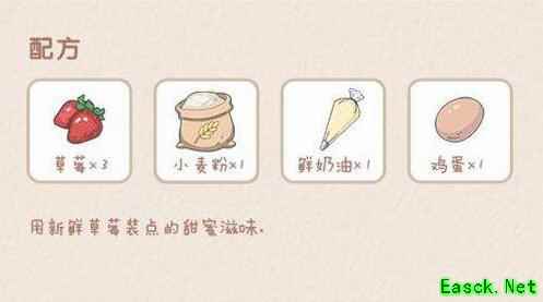《小森生活》草莓蛋糕食谱配方介绍草莓蛋糕配方:草莓*3、小麦粉*1、奶油*1和鸡蛋*1