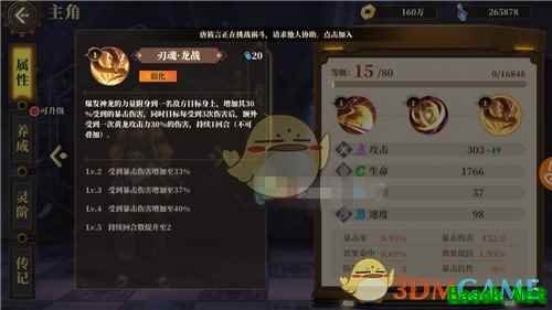 刃魂·龙战:这是一个削弱型的技能,可指定一个敌人增加其30%的暴击伤害承受,每受到3次攻击还额外附加一次黄龙攻击力30%的伤害。