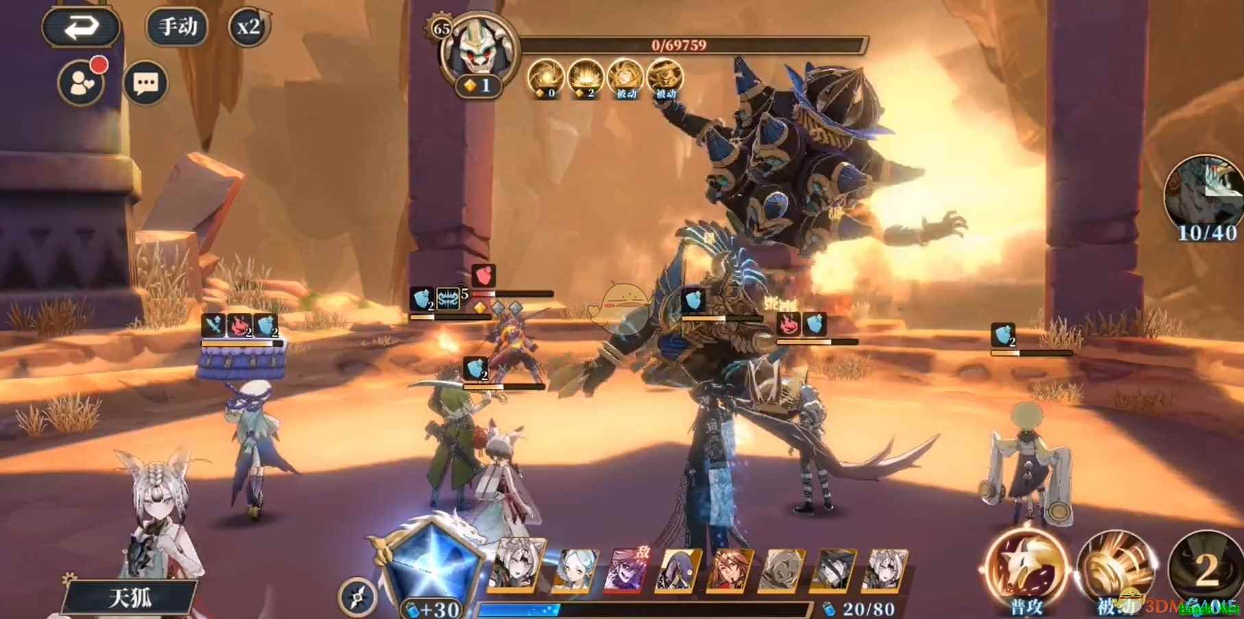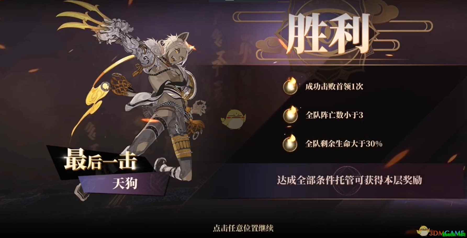 2.小怪为凤皇+祝融,所以依然可以利用天狐特性吃祝融大招伤害。其实不用天狐反而更快,因为天狐位置直接死亡后利用队友天门复活再死于凤皇可以额外触发一次天狗反击补充伤害。