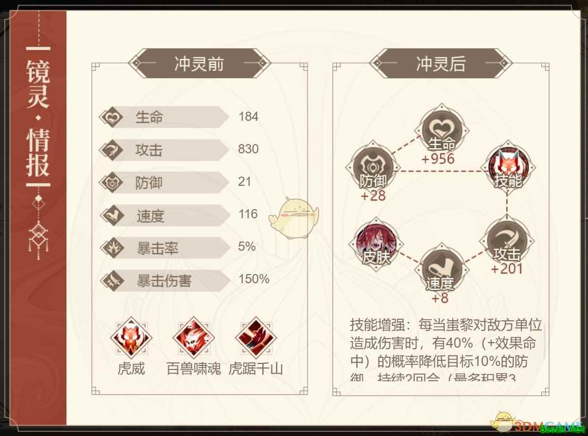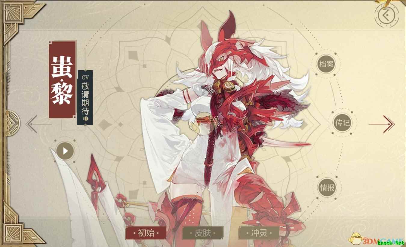 技能增强:每当蚩黎对敌方单位造成伤害时,有40%(+效果命中)的概率降低目标10%的防御,持续2回合(最多积累3层)。 技能介绍1、虎魄龙啸:普攻,对敌方单体造成2次伤害; 2、兽魂逆袭:攻击敌方全体三次,并各有60%的几率降低敌方的行动条,如果把敌方的行动条击退到最后末端,那么会有50%的概率使其眩晕; 3、虎魄威慑:每次蚩黎攻击敌人的时候,有几率降低对方的防御,持续两回合 传记介绍传记一 那一日,本该是蚩黎的婚礼。九黎公主的婚礼,势必声势浩大、繁华富丽。 婚礼前,她的哥哥蚩尤说:“这一战,我必胜。待我归来,亲自为你送嫁。” 她乖巧地在宫殿中端坐,等着哥哥归来。 那是蚩尤啊,他自然是会赢的。 到时候,她的哥哥将会骑着战虎,为她送嫁。整个大荒,都不会有比她更为风光的新娘。