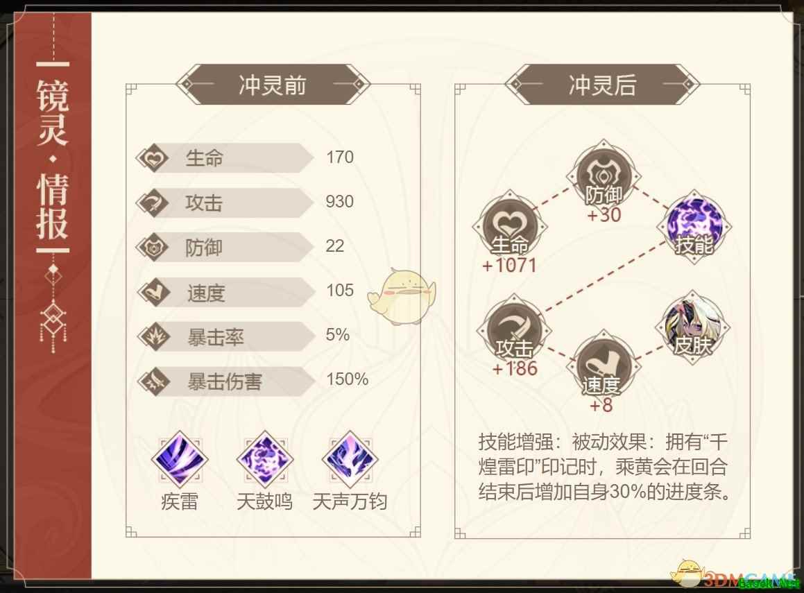 技能增强:被动效果:拥有“千煌雷印”印记时,乘黄会在回合结束后增加自身30%的进度条。 技能介绍1、疾雷:对敌方单体目标造成伤害,并消耗自身1个“千煌雷印”印记,为目标添加“雷霆电刃”效果,持续1回合。 2、天鼓霓裳:释放此技能立即增加3个“千煌雷印”印记,并提高自身30%的攻击力和30%的效果命中,持续1回合(不可叠加)。 3、瞬狱之握:对敌方单体目标造成伤害,若拥有“千煌雷印”印记,则消耗2个“千煌雷印”印记,有50%(+效果命中)的概率使目标“眩晕”,持续1回合。 传记介绍传记一 乘黄化成一只寻常的狐狸的样子,头上顶着一团树枝隐藏自己的角,在林间行走着。忽然…… “烤鸡的味道!我是不是饿糊涂了啊!这种地方怎么会有……” 隔着树丛,他竟然真的看见了篝火上架着的烤鸡,那香味,绝了!而且,这是最爱烤鸡的乘黄…… “好想吃……”乘黄目不转睛地盯着烤鸡,“不行不行,为了烤鸡就不要形象了这不行的。” 就在他还在纠结的时候,那烤鸡的味道忽然越来越近……越来越近…… 乘黄下意识地张嘴一咬……诶?一只长得像老虎一样的家伙,捧着烤鸡递到了他的嘴边?!