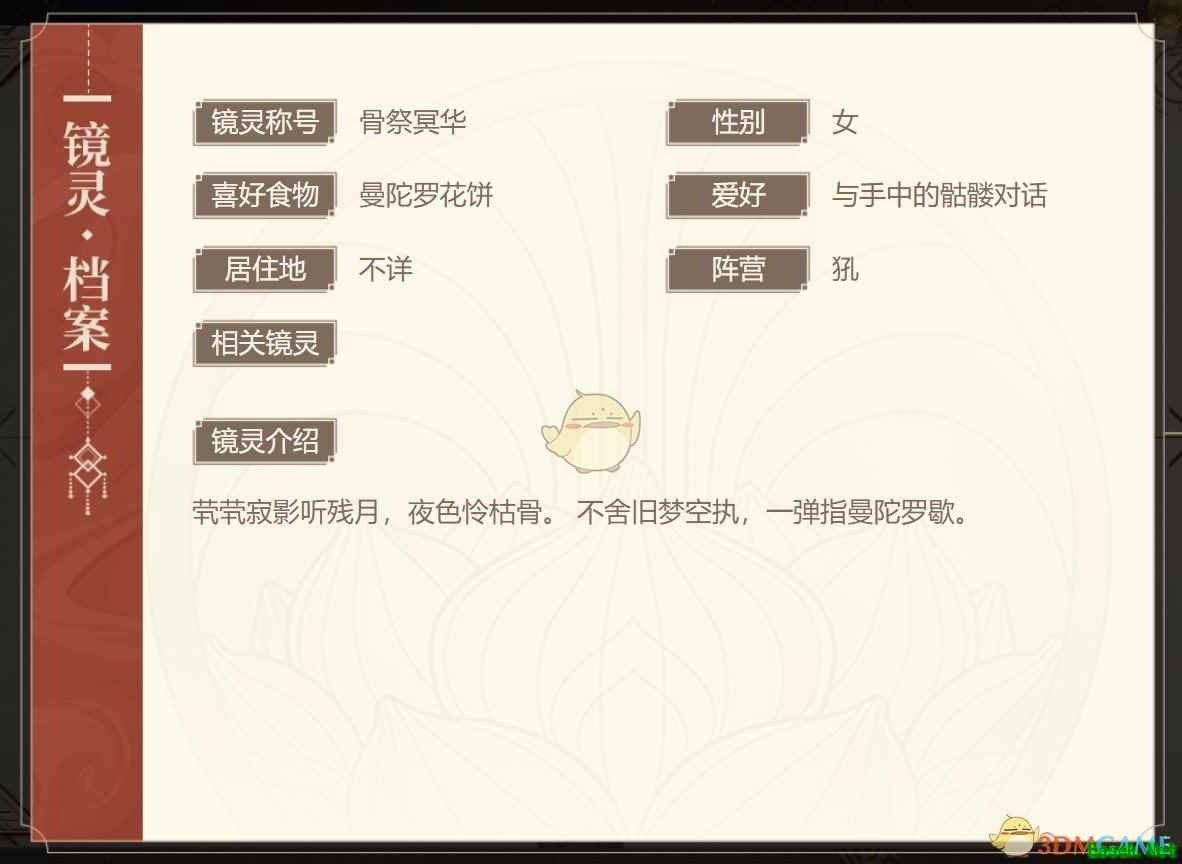 茕茕寂影听残月,夜色怜枯骨。 不舍旧梦空执,一弹指曼陀罗歇。 属性介绍