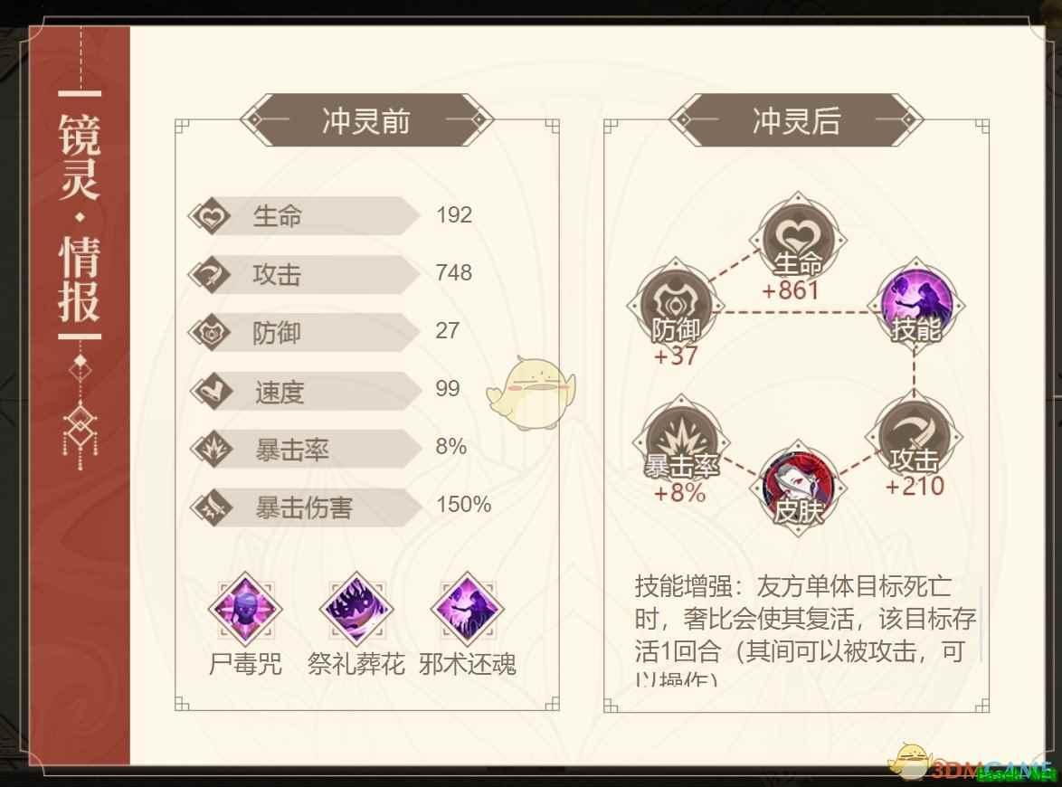 技能增强:友方单体目标死亡时,奢比会使其复活,该目标存活1回合(其间可以被攻击,可以操作)。 技能介绍普通攻击:尸毒咒(不消耗灵气) 奢比凝聚尸毒,对敌方单体目标造成攻击力100%的伤害 单体伤害:祭礼葬花(消耗30灵气) 奢比召唤死亡之花在敌方单体目标身下引爆,对目标造成攻击力240%的伤害,若此技能直接击杀敌人,则会召唤出他的尸体持续1回合(优先级高于复活)尸体的生命值继承目标敌人的10%,无法行动但可以被攻击。若体没有被击杀,则在1回合后产生尸爆,对其余敌方全体目标造成名比攻击力70%的伤害 被动技能:邪术还魂(不消耗灵气) 奢比死亡时,会吸收非召唤物的友方全体目标20%的当前生命值复活自身,且奢比会回复自身所吸取的生命值,但生命值低于30%的队友不会被吸取。友方单体目标死亡时,奢比会使其复活,该目标存活1回合(其间可以被攻击,可以操作)。