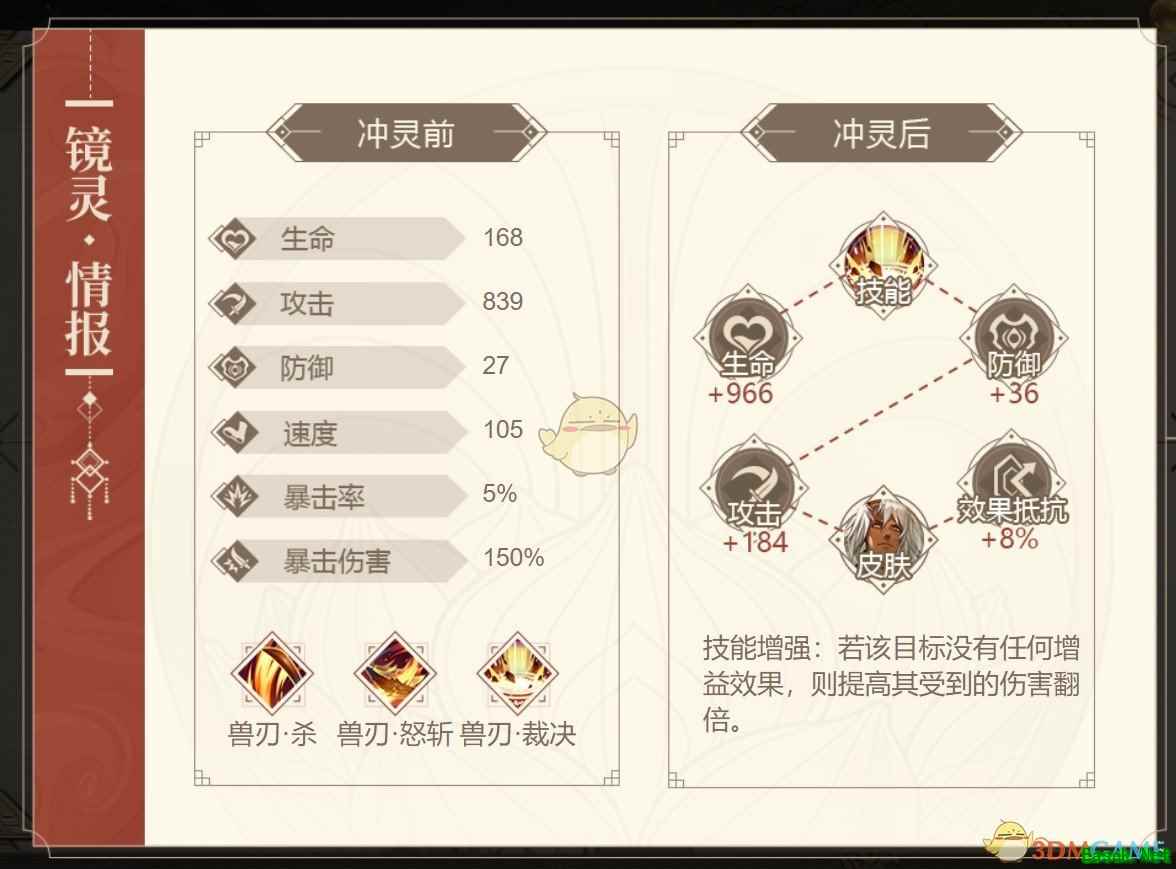 技能增强:若该目标没有任何增益效果,则提高其受到的伤害翻倍。 技能介绍1、兽刃·杀:普通攻击,对敌方单体目标造成伤害。 2、兽刃.怒斩:召对敌方单体目标砍出蓄力一击造成伤害,并驱散该目标的所有增益效果。 3、兽刃·裁决:对敌方单体目标造成伤害,同时对敌方全体目标添加裁决效果,持续至驳下一次回合开始。 传记介绍传记一 他靠坐在树下,满饮了一口壶中烈酒,轻轻抚着已经跟了他许多年的酒葫芦,那是他毕生最爱的女子亲手为他所制。 那个女子……他永远忘不了她当年的笑靥。论容貌,她并不算绝美;论灵气,她更是平平无奇。可在他的眼中,她就是大荒最吸引人的女子,就像是祖神独独为他创造的一般,他与她生来就是要在一起的。 可是……殃及中曲山的战火,葬送了她和他们尚未出生的孩子,也葬送了他此生的希望。 “若醉梦之中能让我时时再见到你,那我宁愿此生再不复醒。”半醉半醒之间,他这样呢喃着。