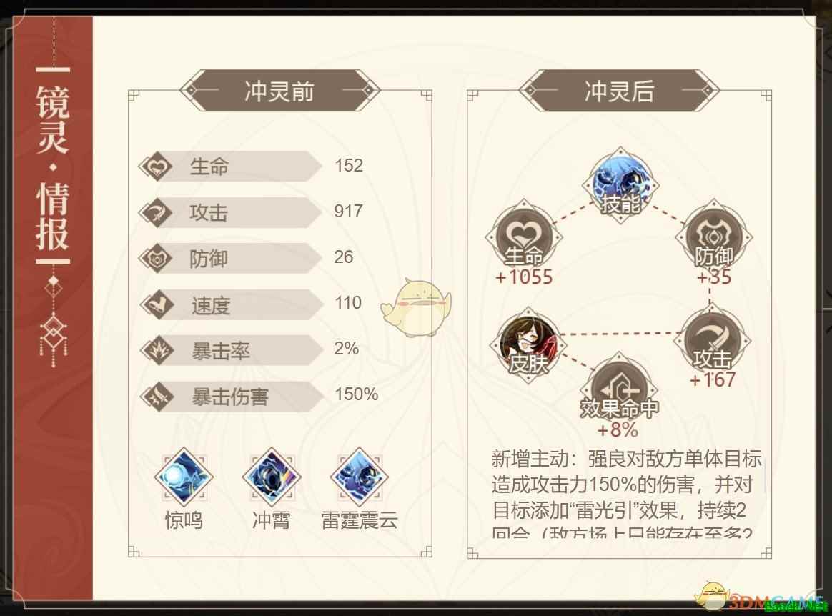 新增主动:强良对敌方单体目标造成攻击力150%的伤害,并对目标添加“雷光引”效果,持续2回合(敌方场上只能存在至多2个“雷光引”效果)。在释放【雷霆冲霄】时,雷轮将优先攻击拥有“雷光引”效果的目标。 技能介绍惊鸣 强良对敌方单体目标造成攻击力100%的伤害。 Lv.2每次伤害提升至105% Lv.3每次伤害提升至110% Lv.4每次伤害提升至115% Lv.5每次伤害提升至125% 冲霄 强良释放4个雷轮,攻击敌方随机目标,每个雷轮造成攻击力20%的伤害,并有20%:(+效果命中)的概率使目标"眩晕”,持续1回合。 Lv.2伤害提升至25% Lv.3伤害提升至30% Lv.4放出5个轮盘 Lv.5放出6个轮盘 雷霆震云 强良对敌方单体目标造成攻击力150%的伤害,并对目标添加“雷光引"效果,持续2回合(敌方场上只能存在至多2个“雷光引"效果)。:在释放[雷霆冲霄]时,雷轮将优先攻击拥有“雷光引效果的目标。 Lv.2伤害提升至155% Lv.3伤害提升至160% Lv.4释放后有50%概率获得额外行动(同一回合只能触发一次) Lv.5释放后获得额外行动(同一回合只能触发一次)