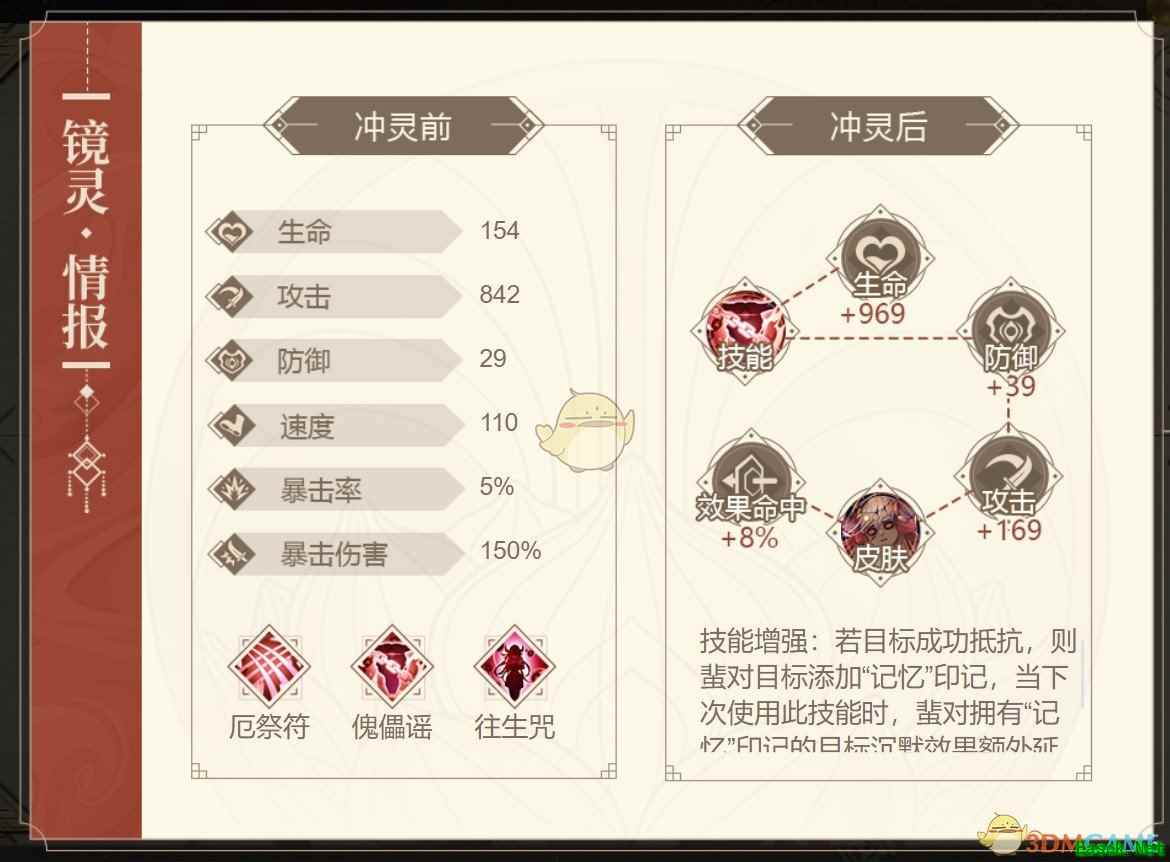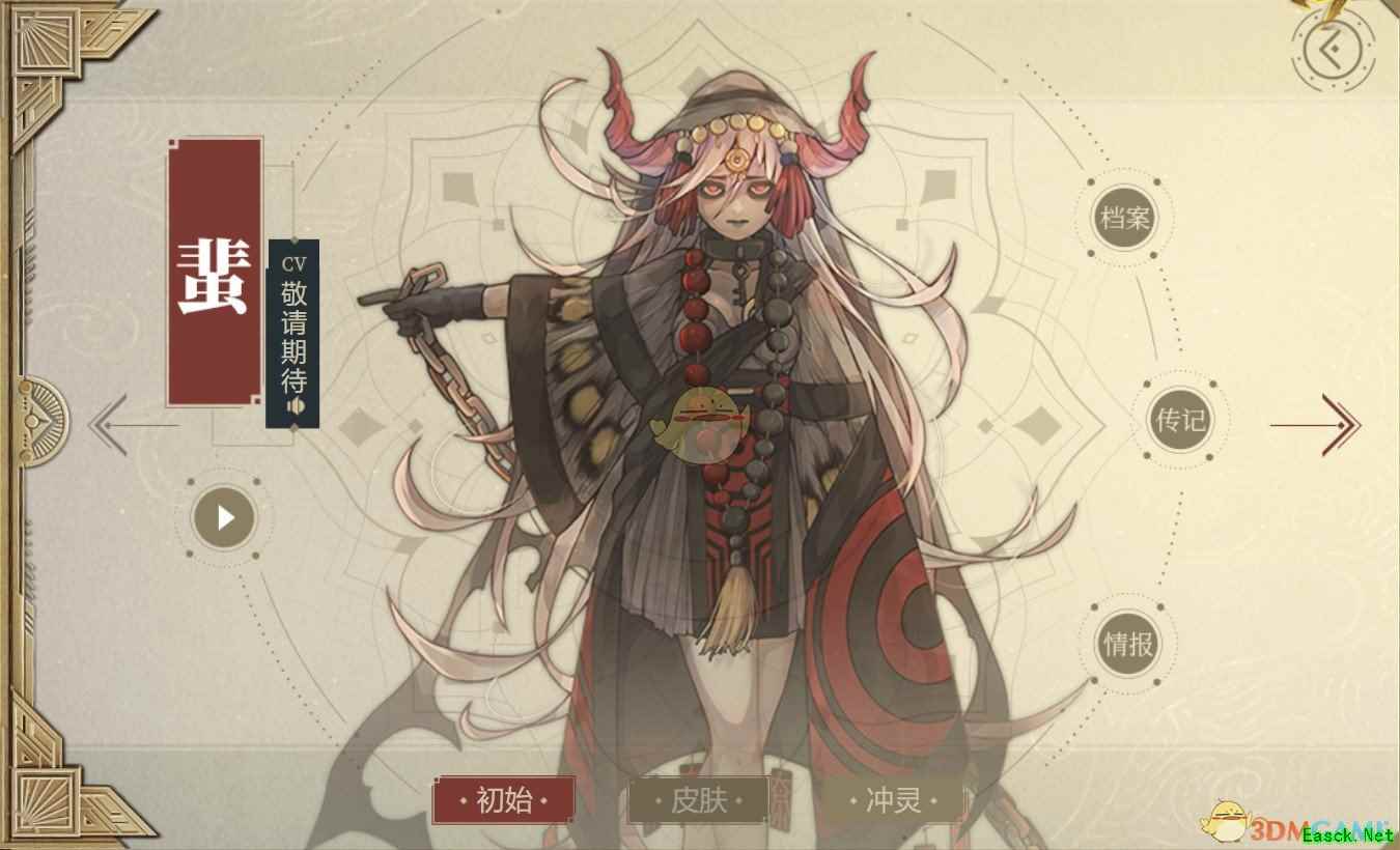 技能增强:若目标成功抵抗,则蜚对目标添加“记忆”印记,当下次使用此技能时,蜚对拥有“记忆”印记的目标沉默效果额外延长1回合,该印记不可叠加。 技能介绍1、符咒:普通攻击,同时有概率封印目标的被动技能,持续一回合; 2、怪物的操控:对敌人全体造成伤害,并有概率沉默敌方,持续一回合; 3、怪物的企图:受到致死伤害时会消耗灵气进入假死状态,并恢复少量生命值,假死状态下不能行动,持续一回合。 传记介绍传记一 “当心点,我的小心肝,你被伤到了可不行~”在刺耳的狞笑中一颗硕大的蛇头升起,死死咬住了砍向少女的白刃。 少女仍是心不在焉的样子,低头沉思着,完全不把面前的山贼和身后的妖怪当回事。 那蛇头连着的牛首怪物也不尴尬,自顾自地对那几个山贼笑道,“你们看起来很贪婪,那你们的血一定很甜了?” 那少女抬头望了望,随手揭下了牛角上贴着的扭曲符咒。 风声过后,山岗上只留下了几具完全被抽干了的人类躯体。