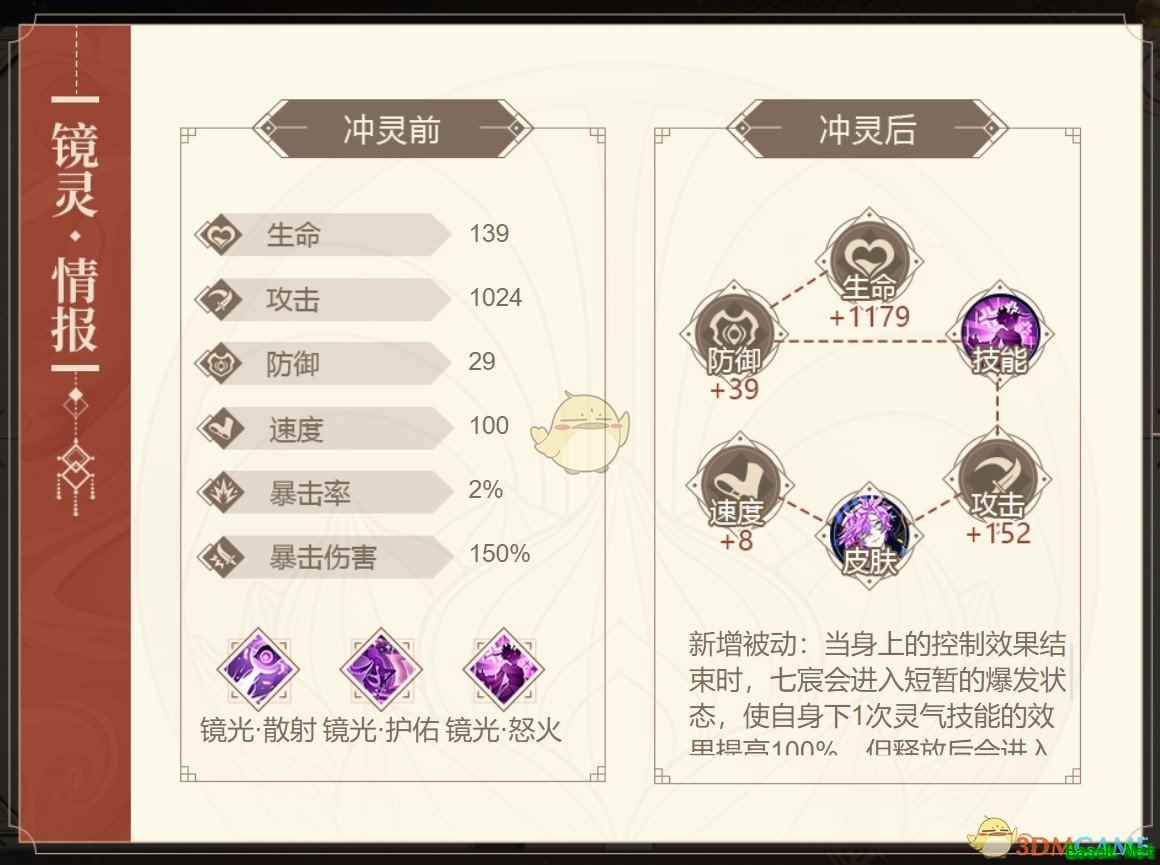 新增被动:当身上的控制效果结束时,七宸会进入短暂的爆发状态,使自身下1次灵气技能的效果提高100%,但释放后会进入虚弱状态,降低自身40%的防御力,持续1回合。 技能介绍镜光·散射:对敌方单体造成伤害; 镜光·护佑:使友方全体获得伤害反弹和效果抵抗,持续一回合; 镜光·怒火:当身上的控制效果结束时,进入爆发状态,使自身下1次灵气技能的效果提高100%,释放后会进入虚弱状态,降低防御力,持续1回合。 传记介绍传记一 七宸用枕头捂住耳朵,但无法隔绝两只乌啾围着他大叫的声音,他微微睁开眼,仲灵叉着腰的身影若隐若现。 “小七!起来散步啦!” 二姐为了叫他早起,已经连续三天过来喊他起床散步了。 七宸叹了口气,软绵绵地从床上坐起来。 这么好的天气,不睡一觉,太可惜了。七宸这么想着,不顾仲灵和乌啾的聒噪,又闭上了眼。 不知过了多久,七宸揉了揉眼睛,觉得有一丝凉意,但身上摸不到柔软的被褥。他睁开眼,自己竟然站在半空中,面前的仲灵瞪着双眼,欲言又止。 “你怎么……你怎么能一边走路一边睡觉啊!!!”