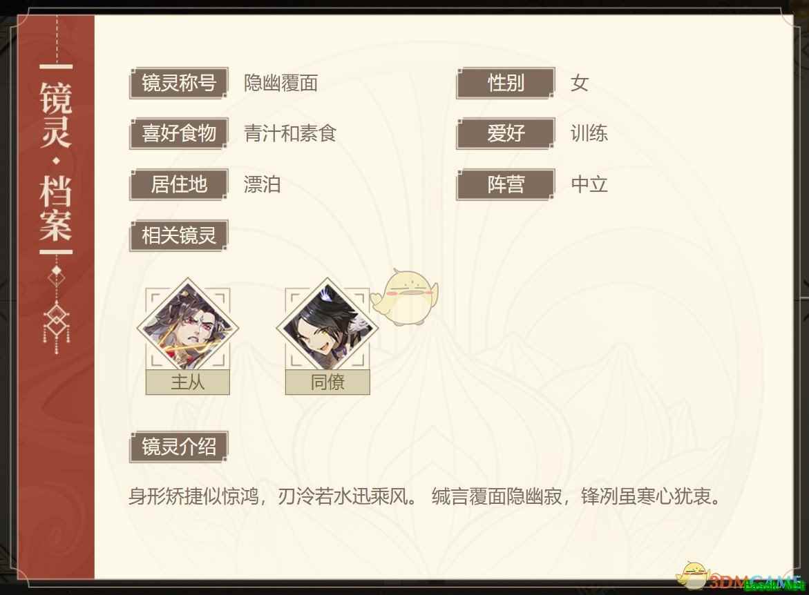 身形矫捷似惊鸿,刃泠若水迅乘风。 缄言覆面隐幽寂,锋冽虽寒心犹衷。 她记不记得自己究竟流浪了多久,也不清楚自己究竟要去哪里,她耳边回荡着的这有一句活下去。 属性介绍