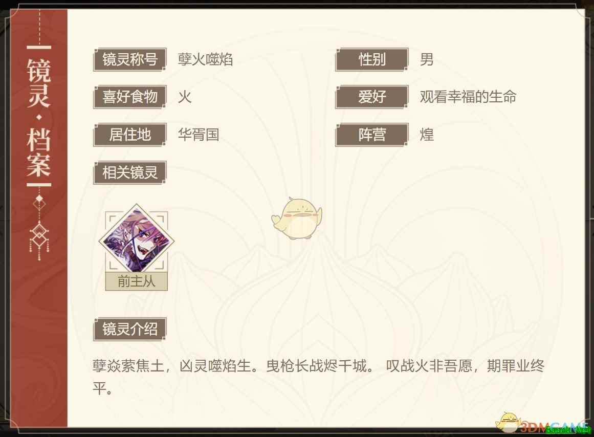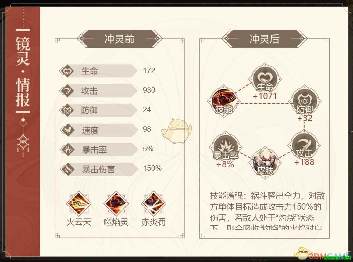 孽焱萦焦土,凶灵噬焰生。曳枪长战烬千城。 叹战火非吾愿,期罪业终平。 祝融的赏识为祸斗带来了无上的荣誉,但事实上祸斗的内心并不向往战争,祸斗的内心十分的温柔,细腻。 属性介绍