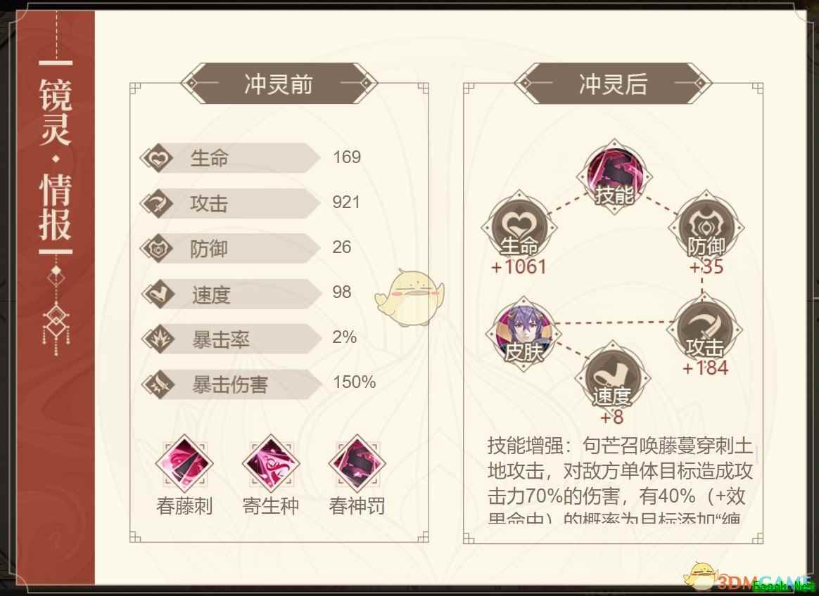 技能增强:句芒召唤藤蔓穿刺土地攻击,对敌方单体目标造成攻击力70%的伤害,有40%(+效果命中)的概率为目标添加“缠绕”效果,持续2回合,拥有“寄生种子”的敌方目标会受到同样的效果。在“缠绕”状态下的目标,其队友可以使用普攻攻击藤蔓解除缠绕,但目标需要承受此次攻击的伤害(缠绕无法被驱散)。 “缠绕”持续时间结束后会在目标身上留下“寄生之种”。 技能介绍春藤刺: 对敌方单体目标造成伤害; 寄生种: 对敌方电梯门䯮造成伤害,并100%(+效果命中)的概率留下一颗“寄生种子”。持续2回合; 春神罚: 对敌方单体木钵啊造成伤害,有40%(+效果命中)的概率添加“缠绕”效果,持续2回合; 持有“寄生种子”状态的玩家同样受到效果; 在缠绕状态下的目标,队友普通接触藤蔓效果,但是目标需要承受此次伤害, “缠绕”持续时间结束后会在目标身上留下“寄生之种”。 传记介绍传记一 句芒是从树木中幻化而生。 刚出生时,大荒中的树木花草对他还很是陌生。他行走在林间,整整三天,几乎没有一株树木主动与他交谈。 初生的句芒,并不知道自己此生的意义为何,他只是觉得迷茫……走到扶桑神树下时,他终于觉得困倦,靠在树下休息。 就在此时,他听到了一阵轻柔的笑声,下意识地抬头,就见一朵红色的花从扶桑树上飘落下来。他下意识地伸出手,那朵花就这样轻轻地落在他的手中。 “你……是什么花?” “我是扶桑树的花!你是谁啊?为什么会带着这样暖洋洋的气息?” “我叫句芒。”