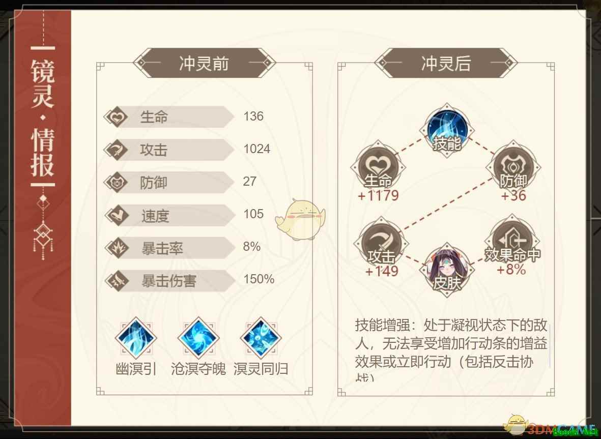 技能增强:处于凝视状态下的敌人,无法享受增加行动条的增益效果或立即行动(包括反击协战)。 技能介绍幽溟引: 攻击敌方单体目标,造成攻击力80%的伤害。如果造成暴击,则击退目标15%的行动条; 溟灵同归: 当友军用普通攻击对凝视引灵灯的敌人造成伤害时,神芝会协战; 沧溟夺魄: 对敌方单体目标和1名敌方随机目标造成攻击力50%的伤害,并有40%(+效果命中)的概率迫使他们进入凝视状态,使他们暂时无法行动,持续神芝下次回合开始,效果可以被驱散)