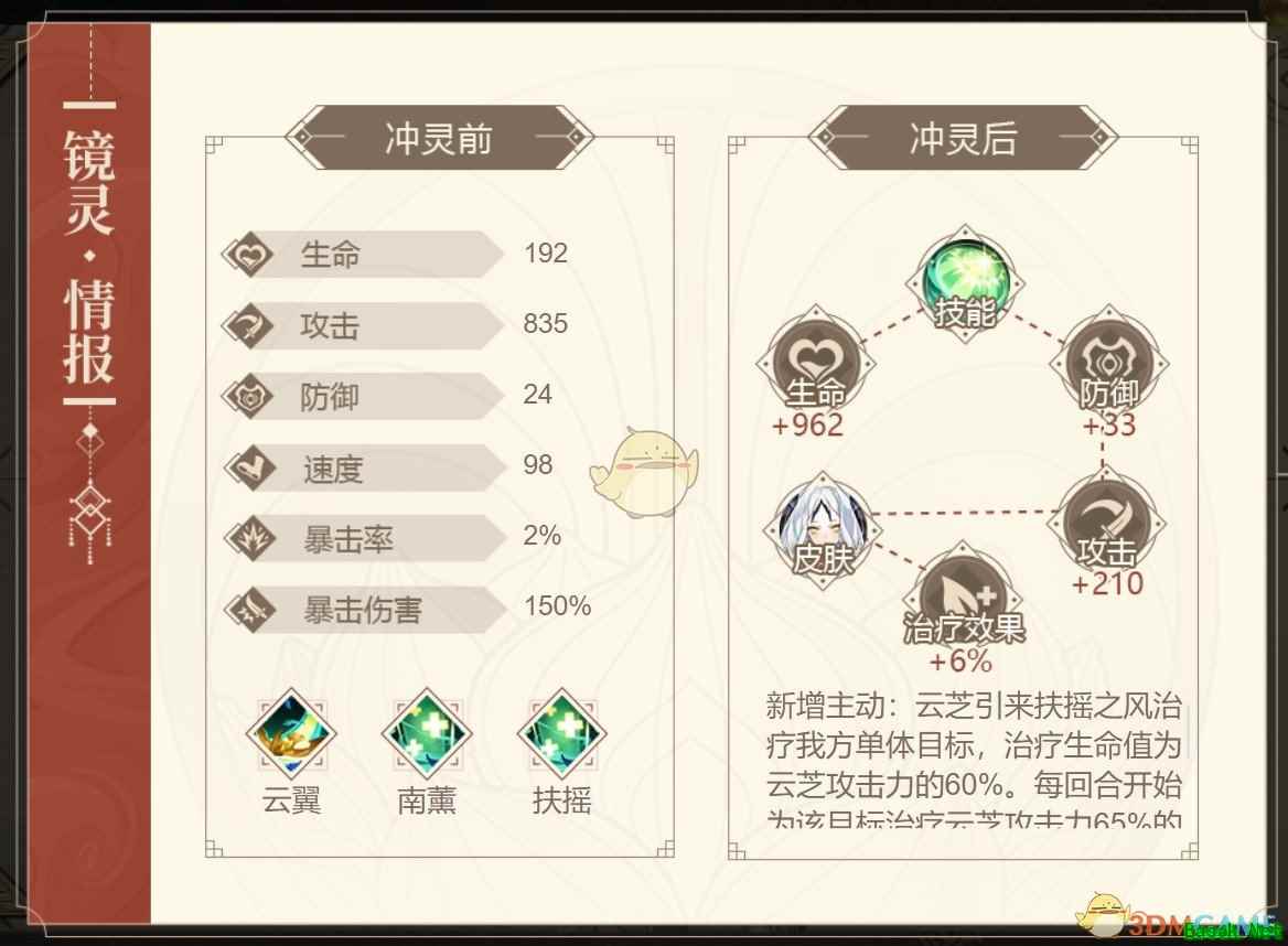 新增主动:云芝引来扶摇之风治疗我方单体目标,治疗生命值为云芝攻击力的60%。每回合开始为该目标治疗云芝攻击力65%的生命值,持续2回合。目标受到3次伤害后解除治疗效果,该效果无法被驱散。 技能介绍云翼:对敌方单体目标造成伤害; 南熏:治疗我方单体目标,为攻击力的285%。如果治疗溢出,则平分给全体镜灵。 扶摇:治疗我方单体目标,治疗生命值为云芝攻击力的60%。每回合开始为该目标治疗云芝攻击力65%的生命值,持续2回合。 目标受到3次伤害后解除治疗效果,该效果无法被驱散。