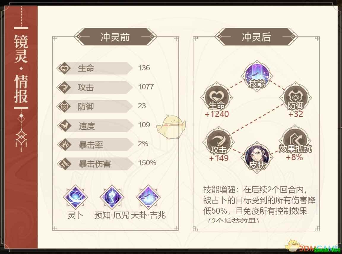 技能增强:在后续2个回合内,被占卜的目标受到的所有伤害降低50%,且免疫所有控制效果(2个增益效果)。 技能介绍灵卜:对敌方单体目标造成伤害。 预知·厄咒:对敌方单体目标和1名敌方随机目标进行“厄运预言”,降低目标伤害,持续一回合。 天卦·吉兆:对我方单体目标进行占卜,免除一次致死伤害,持续2回合。