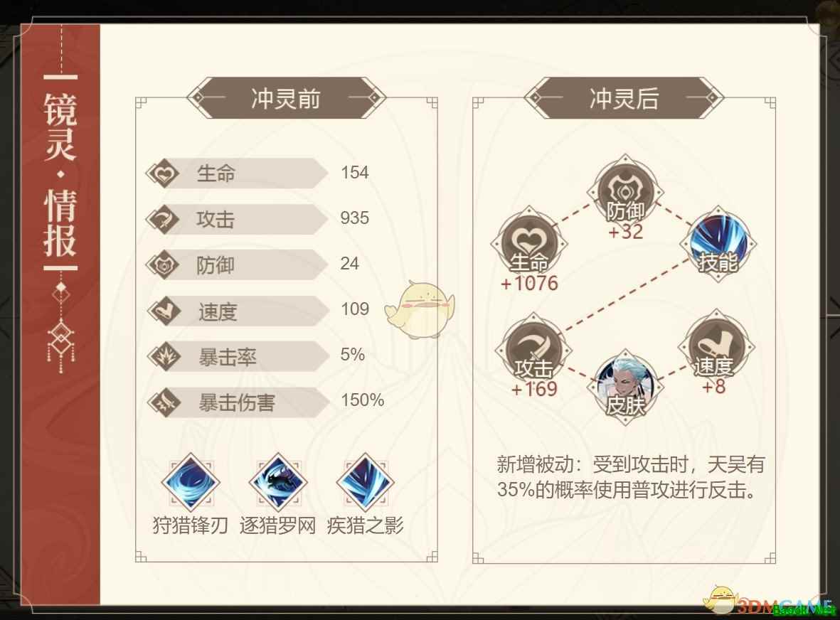 新增被动:受到攻击时,天吴有35%的概率使用普攻进行反击。 技能介绍感恩焱之痛吧:对一名敌人释放3颗火球并造成伤害,若暴击会额外增加1颗火球,上限为7颗。 戾火教你做人:对目标造成伤害,并增加自身暴击率,持续1回合。 突破新增-苦难令人成长:每次造成伤害,会使目标所受伤害增加3%,持续1回合,(最多叠加5次)。