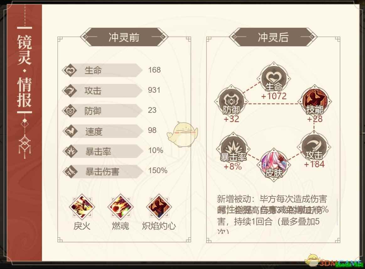 新增被动:毕方每次造成伤害时,会提高自身3%的暴击伤害,持续1回合(最多叠加5次)。 技能介绍感恩焱之痛吧:对一名敌人释放3颗火球并造成伤害,若暴击会额外增加1颗火球,上限为7颗。 戾火教你做人:对目标造成伤害,并增加自身暴击率,持续1回合。 突破新增-苦难令人成长:每次造成伤害,会使目标所受伤害增加3%,持续1回合,(最多叠加5次)。