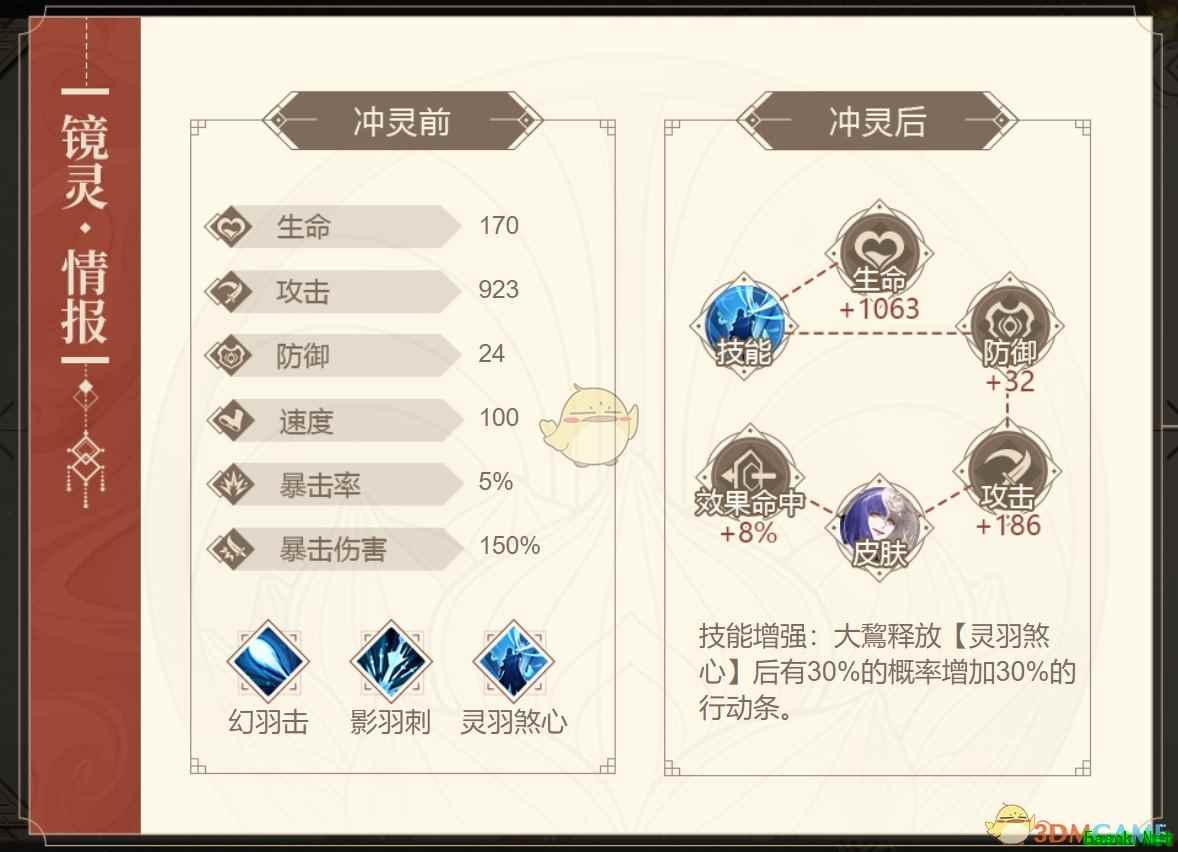 技能增强:大鵹释放【灵羽煞心】后有30%的概率增加30%的行动条。 技能介绍幻羽击 大鵹对敌方单体目标造成攻击力100%的伤害。 影羽刺 大鵹释放影刃,对敌方单体目标造成攻击力260%的伤害。若目标处于“混乱”状态,则额外提升20%的伤害。 灵羽煞心 大鵹有40% (+效果命中)的概率使敌方单体目标和1名敌方随机目标“混乱”,持续1回合。并且大鵹会偷取他们15%的攻击力(可叠加,单目标上限3次)持续目标的2回合。