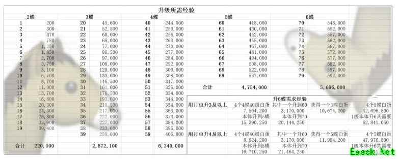 五星升六星所需经验介绍条件: 1-20级 11w经验 20-40级 144w经验 40-60级 318w经验 (以上仅计算月银螈) 每次突破需要3w金币