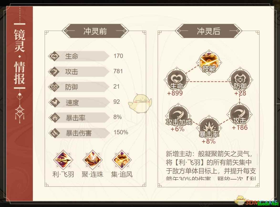 新增主动:般凝聚箭矢之灵气,将【利·飞羽】的所有箭矢集中于敌方单体目标上,并提升每支箭矢30%的伤害,释放一次【利·飞羽】后解除此效果。拥有此技能效果时,无法再次释放【集·追风】(无法被驱散)。 技能介绍利·飞羽: 对敌方单体目标造成伤害 聚·连珠: 释放利·飞羽时增加一支箭矢,造成额外的伤害,持续整场战斗,最高额外射出五次,行动结束自动进行聚·连珠 比翼齐飞(突破新增): 将【利·飞羽】的所有箭矢集中于敌方单体目标上,并提升每支箭矢30%的伤害,释放一次【利·飞羽】后解除此效果。 拥有此技能效果时,无法再次释放【集·追风】(无法被驱散)。