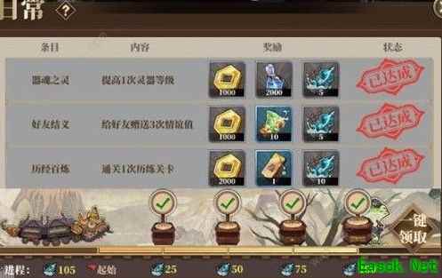《山海镜花》日常任务完成攻略一、必做日常 1、姑瑶幻境 通关瑶10后,把每天的瑶10双倍都刷完,然后分配体力,建议前期全部投入到瑶10中,提高镜灵练度。 2、昆仑之墟 (1)通关昆10前,每天四次做做任务拿灵器升级奖励即可。 (2)周日刷昆10性价比最高,周五的灵器算是比较有用的,所以建议根据情况刷周五灵器,周六买的精力力可以留给周日刷昆10。 3、大荒战图 最好每天全部刷完,试一试当前自己的练度能刷个算哪个,限购建议搬空,有剩余在拿经验药水。