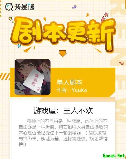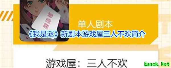 《我是谜》新剧本游戏屋-三人不欢上线了,这个新剧本怎么样呢?新剧本的凶手是谁呢?这些都是需要大家去游戏中自我探寻的,下面给大家带来的是《我是谜》新剧本游戏屋三人不欢简介,想要简单了解剧本的小伙伴可以关注一下!