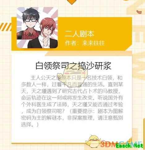 >>>>《我是谜》新剧本游戏屋三人不欢简介 以上就是小编整理带来的《我是谜》2人剧本白领祭司之捣沙研浆简介,更多精彩内容,请点击关注手游网,小编将持续为您更新! |