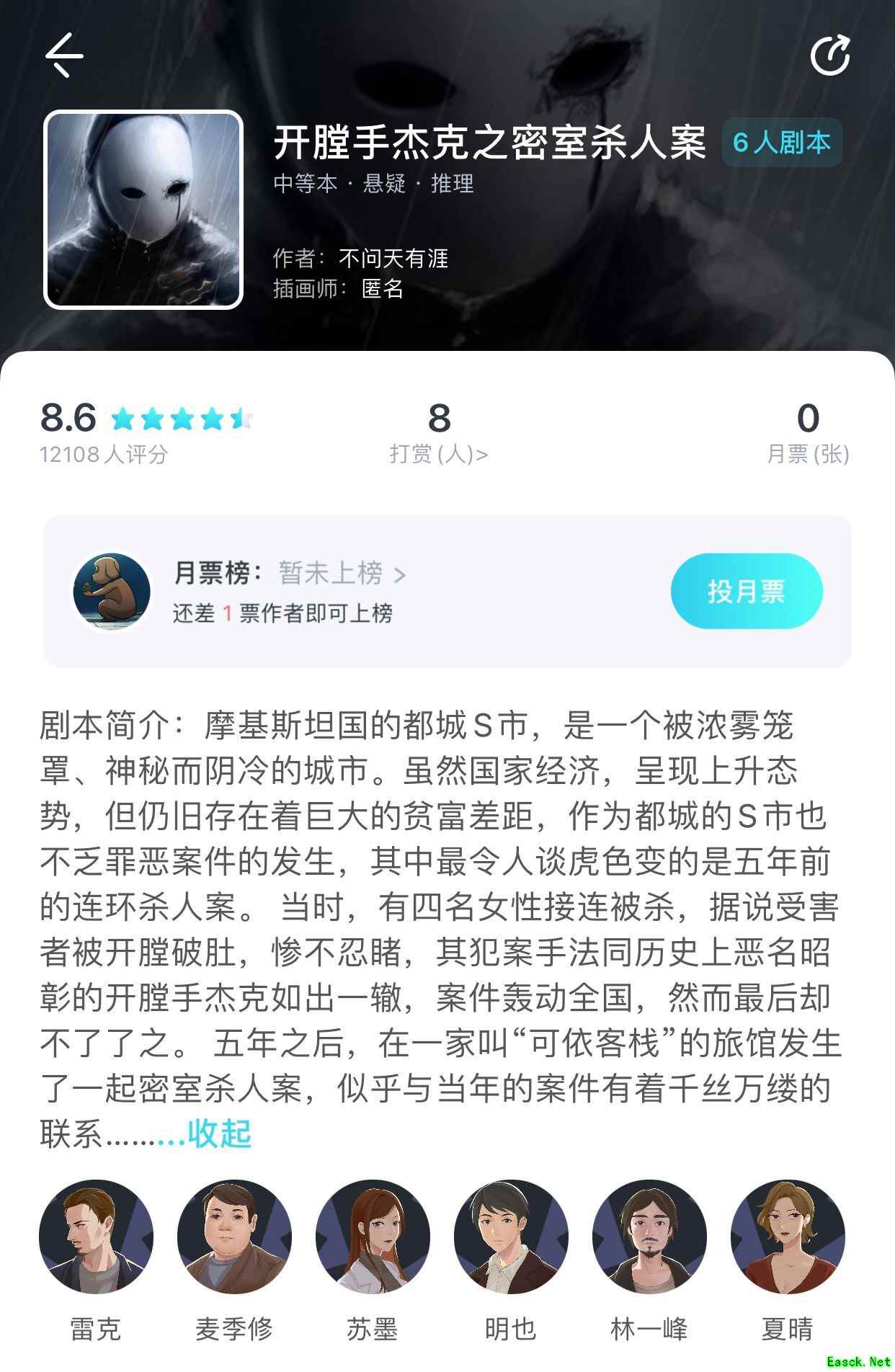 《我是谜》开膛手杰克之密室杀人剧本怎么投票?这个本是一个连环杀人案,下面给大家带来的是《我是谜》开膛手杰克之密室杀人答案介绍,感兴趣的小伙伴可以关注一下! >>>>小编推荐:《我是谜》剧本合集 >>>>小编推荐:《我是谜》剧透凶手合集