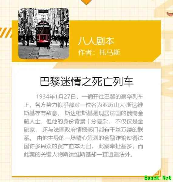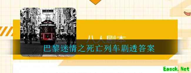 《我是谜》巴黎迷情之死亡列车剧本的凶手是谁呢?这是一个8人本,想要推理出最后真凶并不容易,下面给大家带来的是《我是谜》8人剧本巴黎迷情之死亡列车剧透答案简介,想要简单了解剧本的小伙伴可以关注一下! >>>>小编推荐:《我是谜》剧本合集 >>>>小编推荐:《我是谜》剧透凶手合集