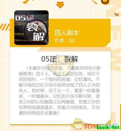 《我是谜》4人剧本05团:裂解怎么样呢?该剧本的凶手是谁呢?这些都是需要大家去游戏中自我探寻的,下面给大家带来的是《我是谜》4人剧本05团:裂解简介,想要简单了解剧本的小伙伴可以关注一下! >>>>小编推荐:《我是谜》剧本合集 >>>>小编推荐:《我是谜》剧透凶手合集