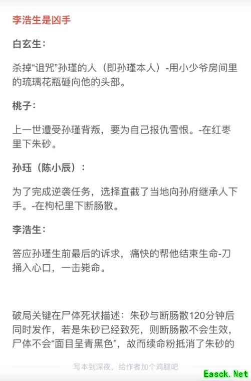 剧本作者:子非鱼 剧本类型:古装 剧本人数:4 剧本时长:1-2小时 人物介绍: 白老板:41岁,乐善好施的京城富商,孙家的生意伙伴,与孙老爷关系一直不错。 桃子:18岁,家生子,面容清秀娇俏,孙小少爷的婢女。 孙珏:22岁,孙家庶出的大少爷,性格软弱内向,对弟弟妹妹颇为疼爱。 李浩生:24岁,跟随白老板前来祝寿的小厮。 凶手:李浩生